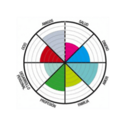 Considera el centro de la rueda como valor 0 y la parte más externa como valor 10, valora tu nivel actual de satisfacción en cada una de las áreas, simplemente coloreando cada quesito, desde dentro hacia afuera.